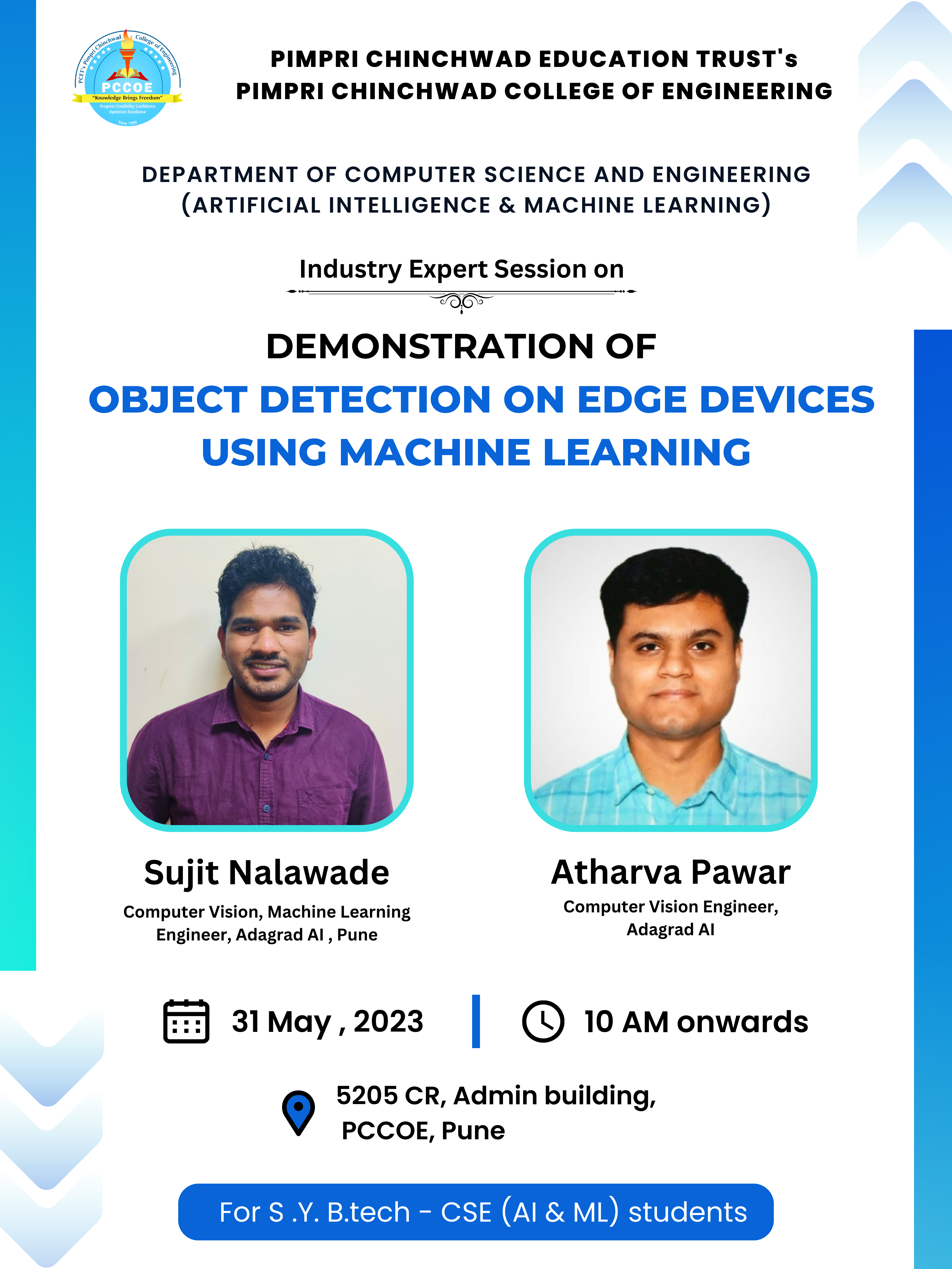 An Industry expert session was conducted on “Object detection on Edge devices using Machine Learning” for our SYBTech students. The demonstration of real time work at Industry on edge AI-powered object detection was given by Computer Vision and Machine Learning Engineers – Mr Sujit Nalawade and Mr Atharva Pawar from Adagrad AI, Pune. Session was conducted on 31st May 2023 from 10 to 1 pm.