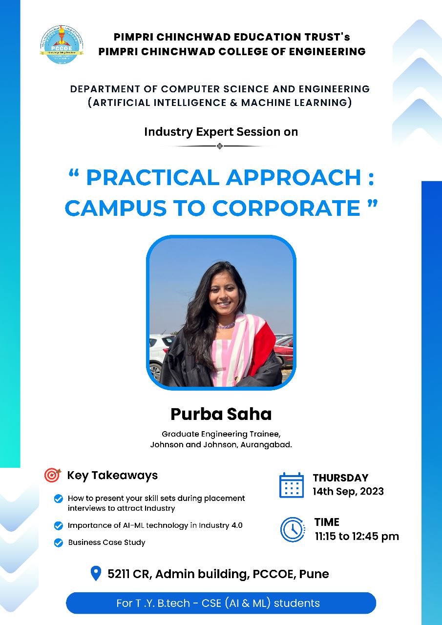 An industry guest sesion on "Practical Approach : Campus To Corporate" was conducted on Thursday, 14th Sep 2023 from 11:15 am to 12:45 pm