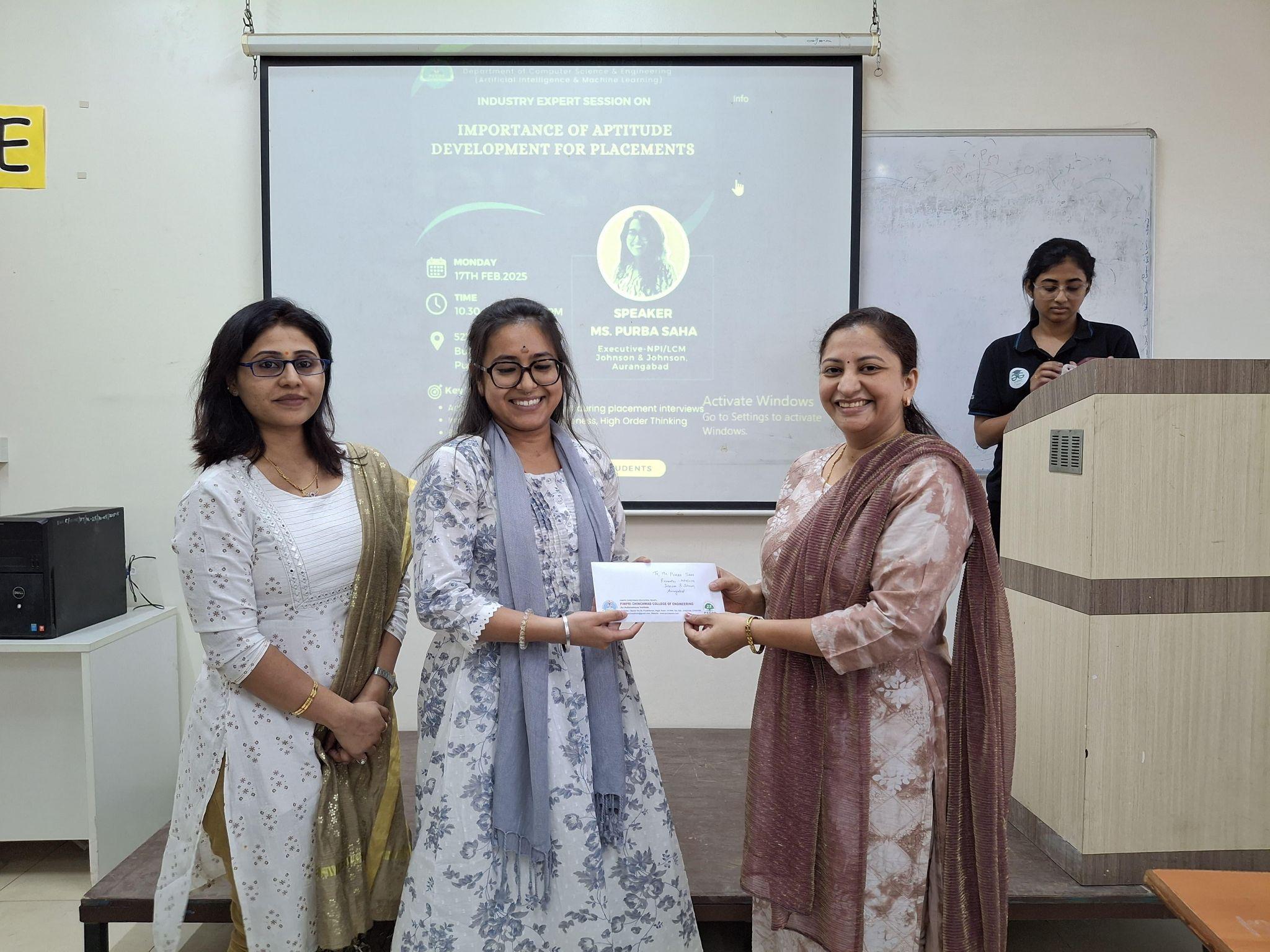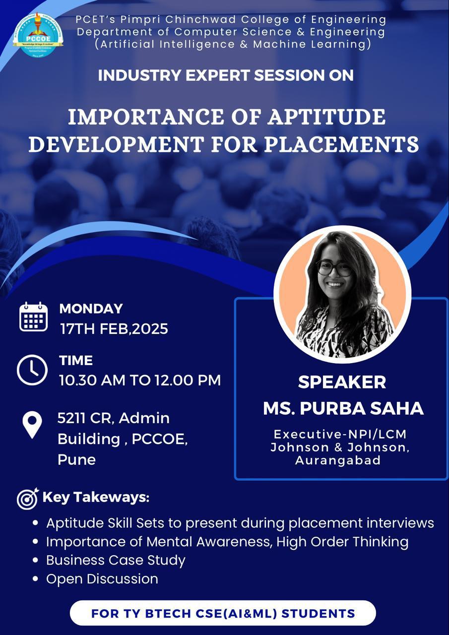 An industry guest sesion on "Importance of Aptitude Development for Placements" was conducted on Monday, 17th Feb 2025 from 10:30 am to 12:00 pm The session was delivered by Ms Purba Saha, Graduate Engineering Trainee, Johnson and Johnson , Aurangabad.