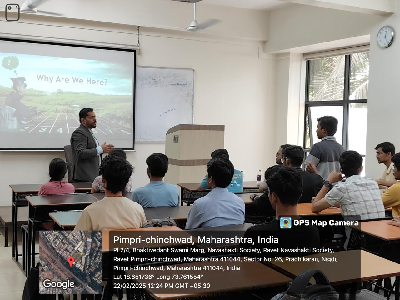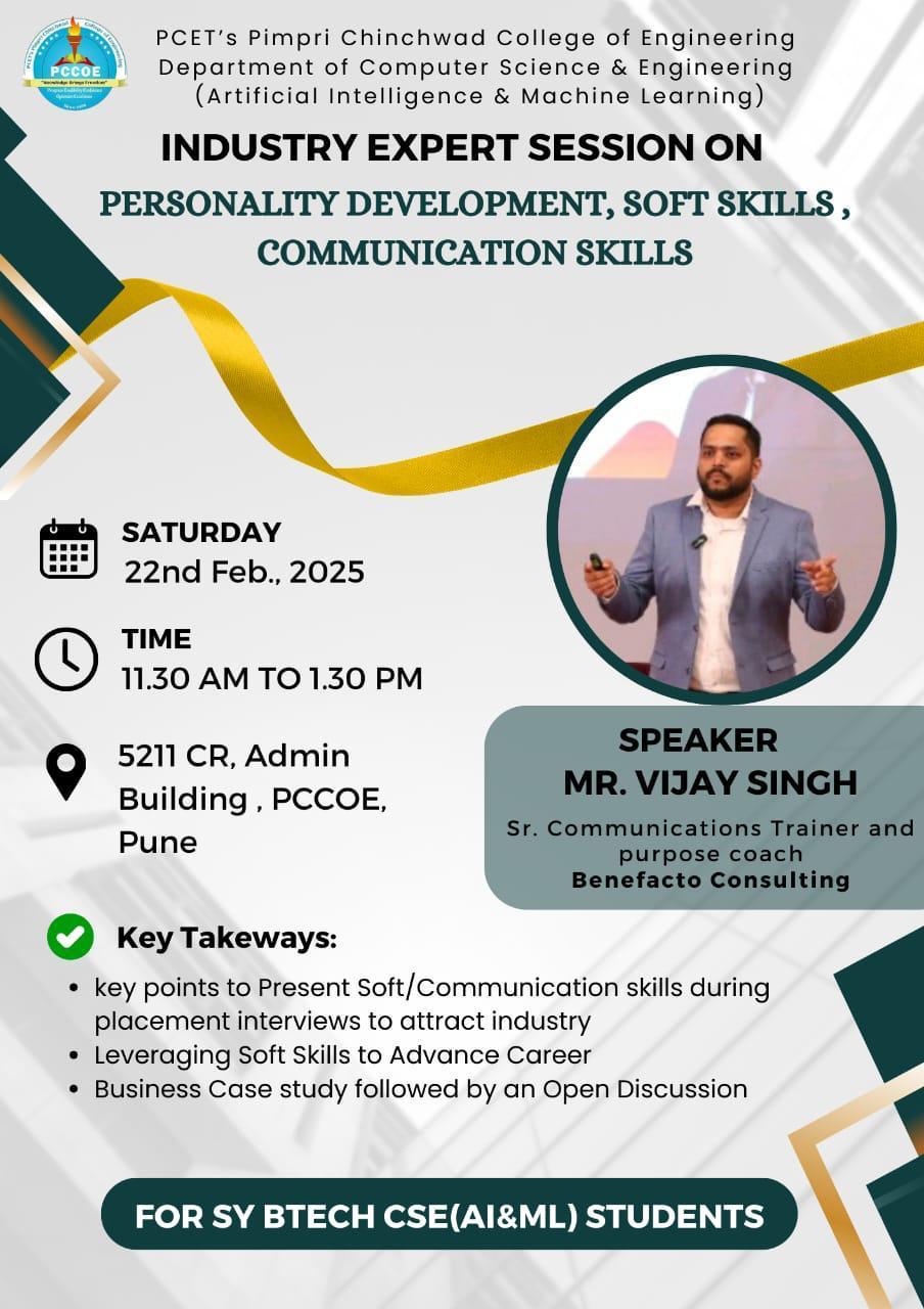 An industry guest session on "Personality Development, Soft Skills, Communication Skills" was conducted on Saturday, 22nd Feb 2025, from 11:30 am to 1:30 pm The session was delivered by Mr. Vijay Singh, Sr. Communication Trainer and Purpose Coach, Benefacto Consulting. .